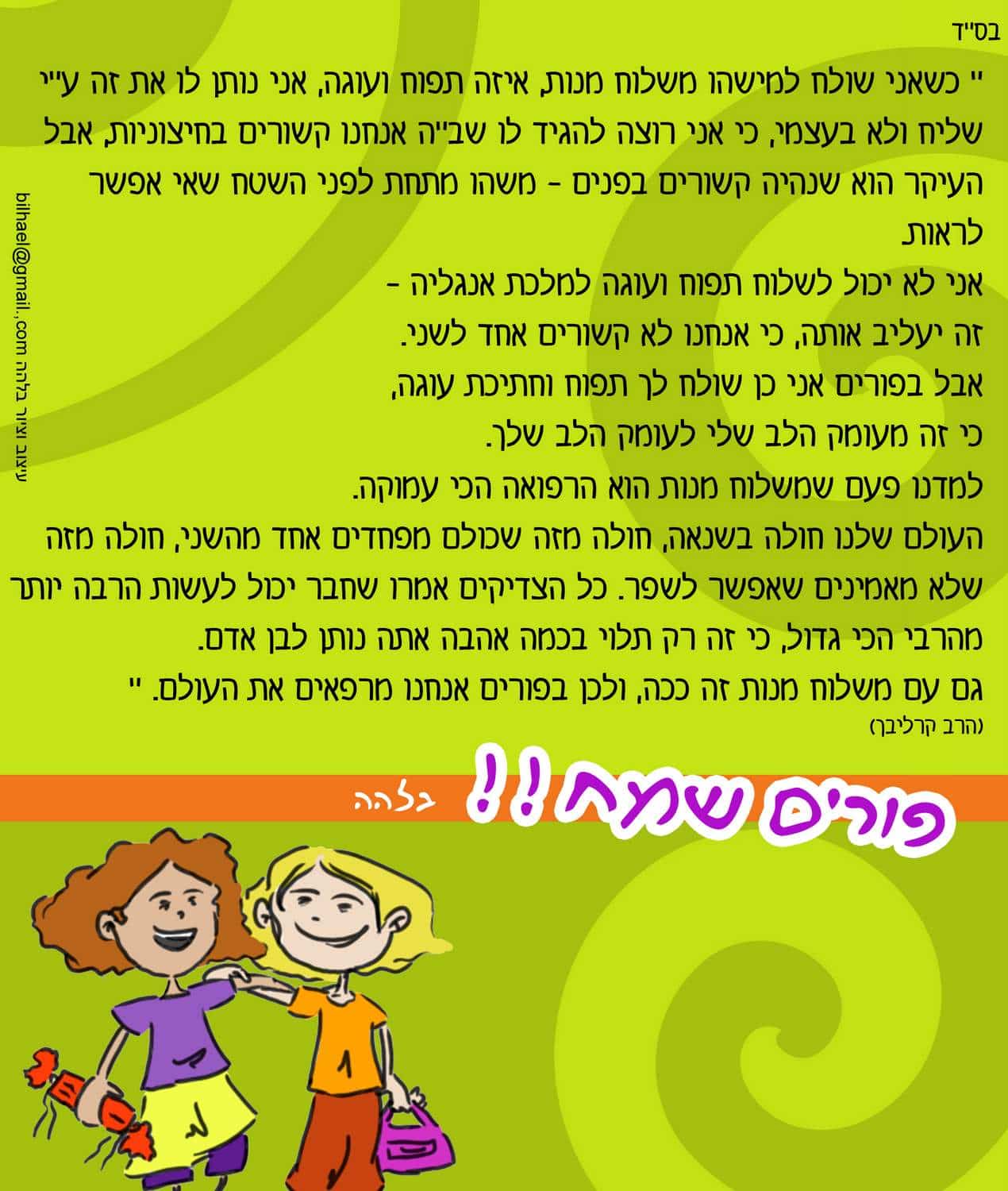 ערב שבת ולקראת פורים בחרתי להביא כמה משלוחי מנות. בזכות הרב קרליבך המשלוחים הגיעו אליי. המשלוחים לא ארוזים עם מוצרי [...]